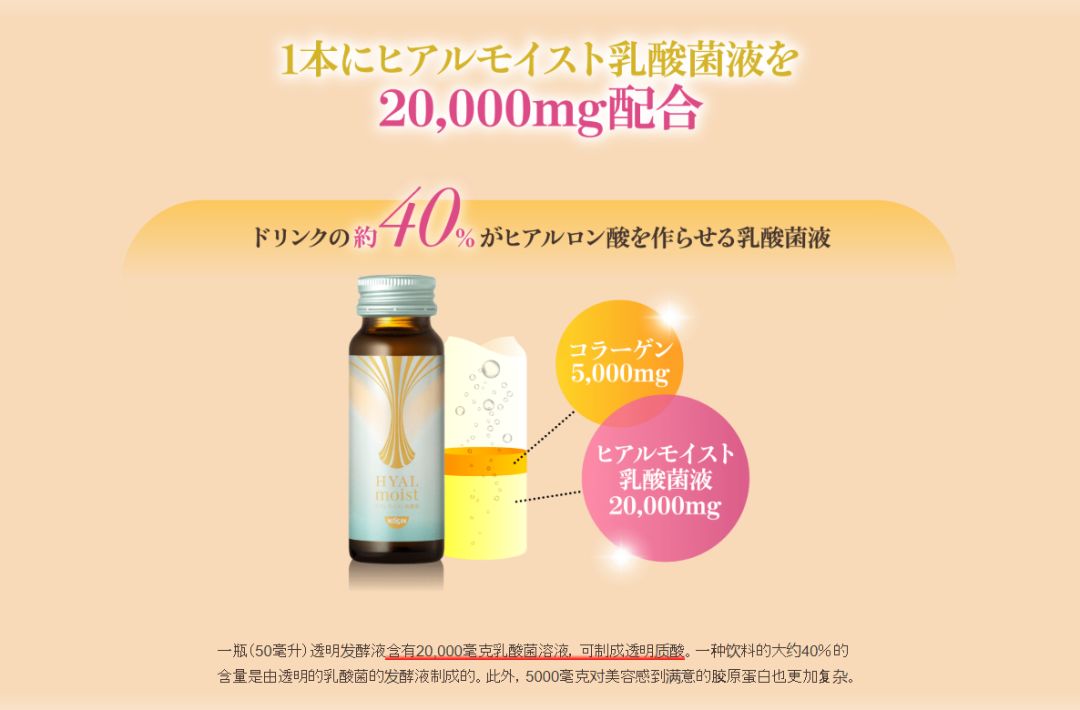 而在此前,日本方便食品日清也曾推出零食饮料新品涉足这一领域。根据其产品官网显示,一瓶50ml的饮料,含有40%的乳酸菌液,有20000mg,乳酸菌液可以转化成透明质酸,透明质酸是目前非常流行的美容成分,这是使肌肤水嫩的重要基础物质,起到保护水分的作用,也被称为玻尿酸。此外每瓶含有5000mg胶原蛋白,胶原蛋白也是目前非常流行的美容成分。